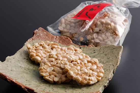 小粒の落花生を飴で丸い板状に固めた飛騨地方に伝わるとても香ばしい豆菓子。落花生はインド産または北米産の小粒のものを使用。大粒の千葉県産落花生よりもこちらの方が食べた感じがかるく口になじむからです。サクッと口の中で落花生の香ばしい香りが広がりやみつきになるおいしさです。