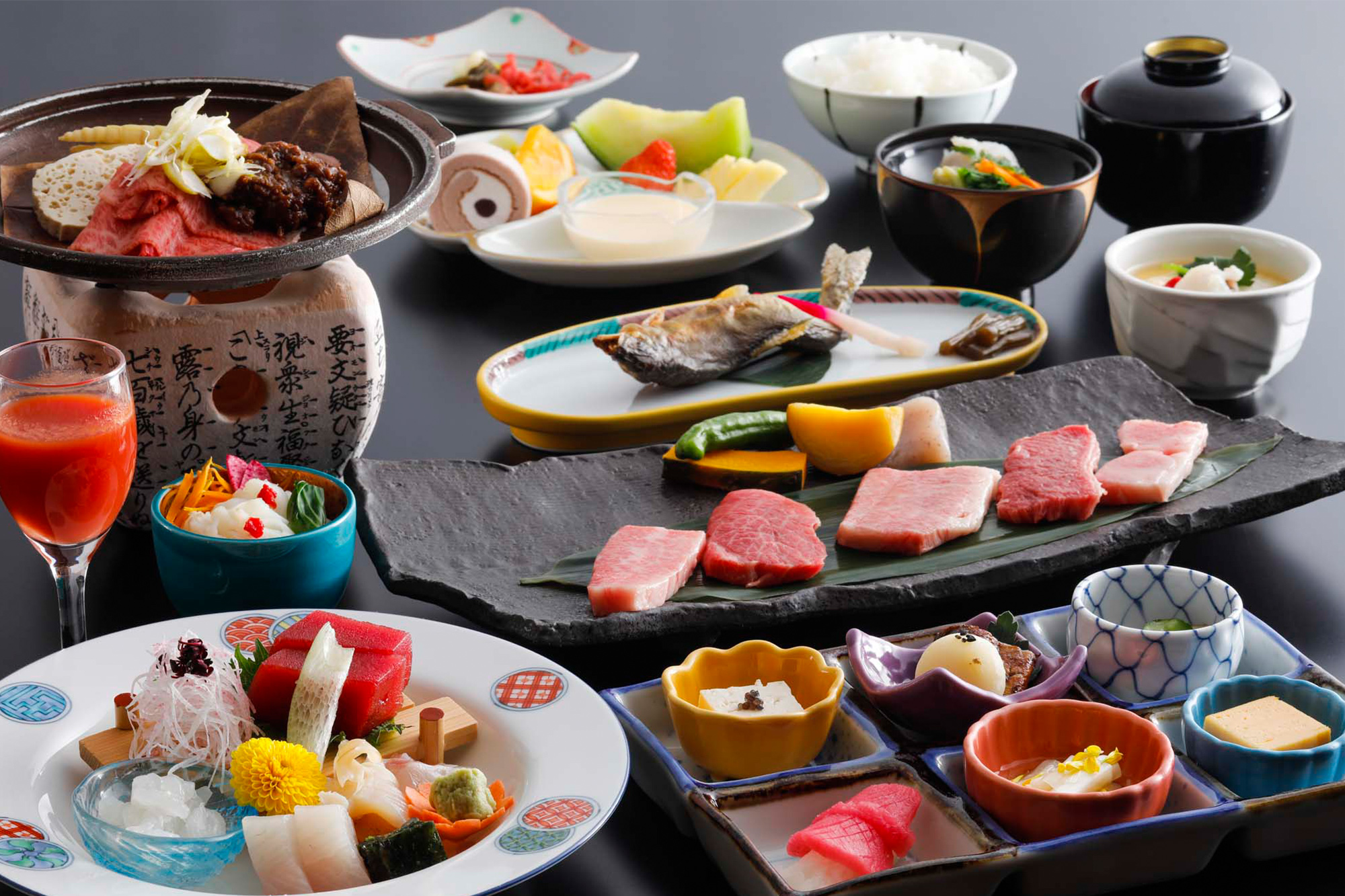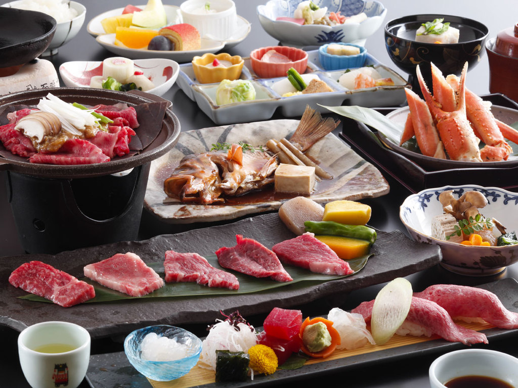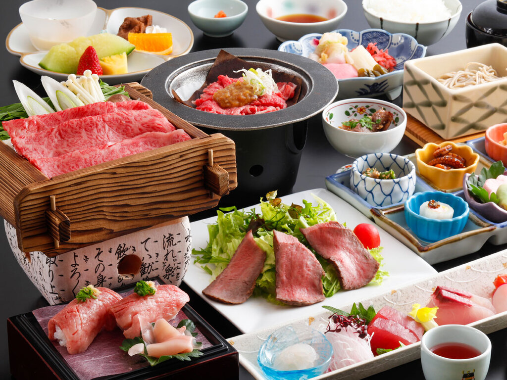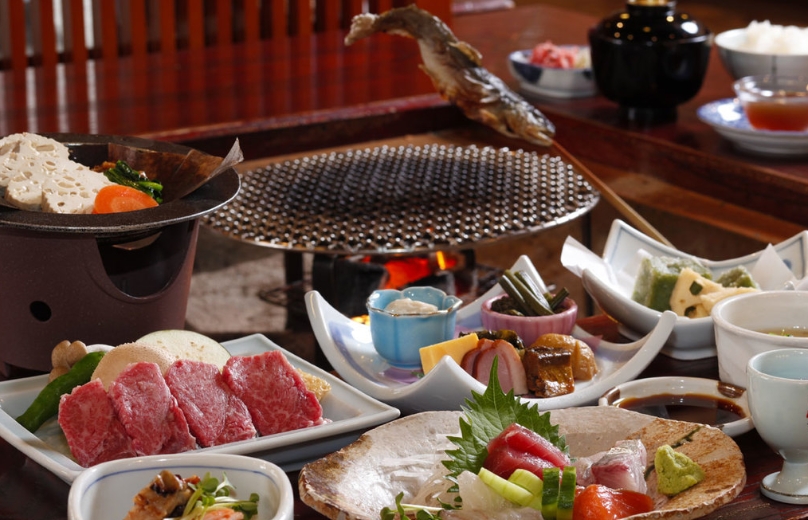 ⽇本料理のお⾷事処”緑亭”では全国に誇る⾃慢の飛騨牛、⼭菜や川⿂といった⾶騨の⼭々が育むご馳⾛に、⽇本海の海の幸。