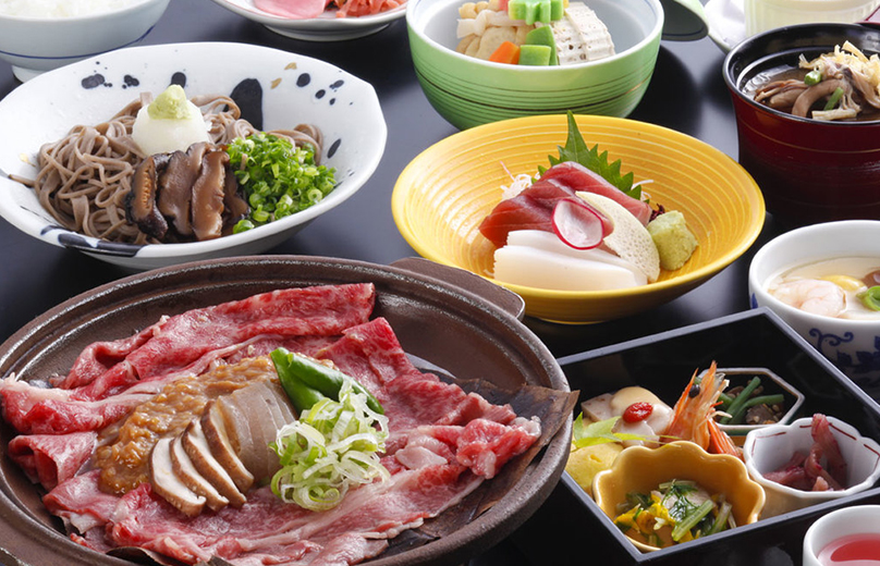 ⽉替わりでご提供しているご昼⾷。⾶騨⽜の⼀品料理に加え、新そばや⼭菜など季節の⼩鉢や、正⽉やひな祭りなどの四季の⾏事にちなんだお献⽴も。