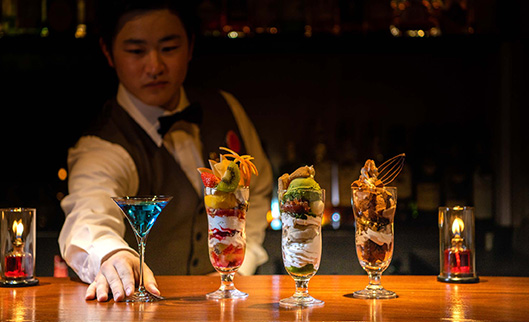夜はお庭がライトアップされ、ムーディーなナイトラウンジへ。ウイスキーやバーボン、カクテルなどご用意しております。ご宿泊の方は湯上がりの待ち合わせや、ご夕食後のちょっとした休憩などに、カフェバー利用の方は近隣のカフェが閉店する時間でも営業しておりますので食事の後の〆パフェはいかがでしょう。高山旅行の夜のゆったりした時間を楽しみたい方はぜひお飲物と共にお楽しみください。