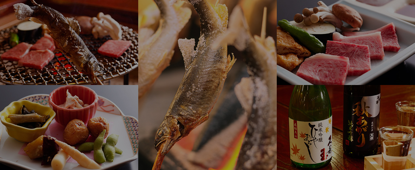 飛騨牛に加え、春は若筍、夏は鮎の塩焼き、秋は松茸や季節の天ぷらなど旬の食材や地元の食材が並ぶお品書きで地元の味をお楽しみ頂けます。