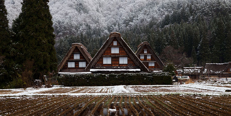 木と縄だけで三角形を基本に 組み上げられ、豪雪にも耐えられるよう工夫されたしなやかな構造。今なお、人々が生活を営み、支えあい手入れをすること で現存する唯一無二の光景です。